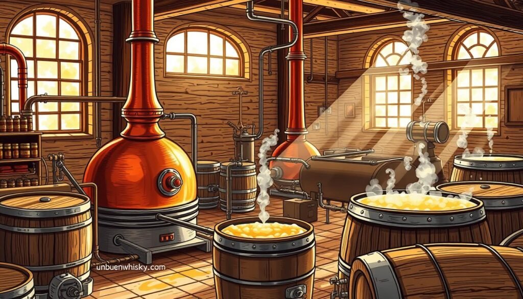 La destilación de whisky en Estados Unidos es un arte. Se ha perfeccionado por siglos, mezclando tradición y tecnología. Cada paso varía según el whisky y las leyes de cada estado. Pero siempre incluyen molienda de granos, maceración, fermentación, destilación, añejamiento y embotellado.